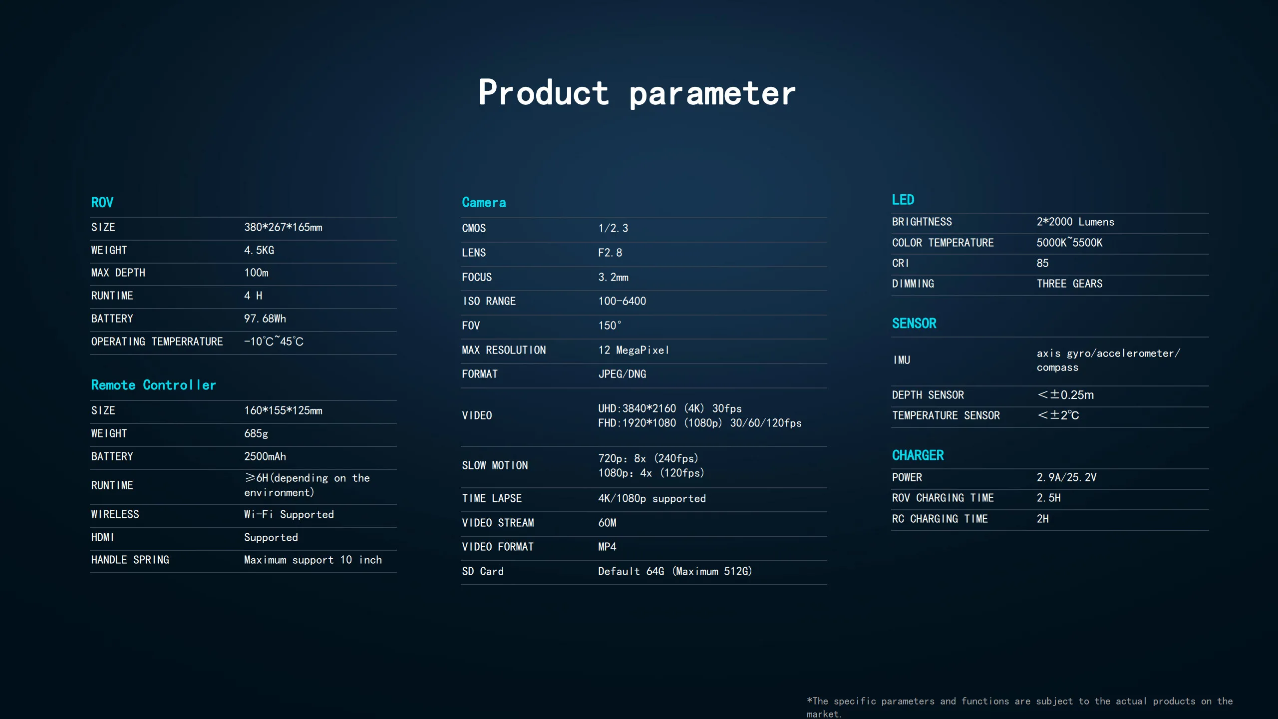 Lite: Drone ×1 Remote Controller ×1 100m Tether ×1 Mounting Base ×1 Power Cord & 3 in 1 Charger ×1 EPP Box ×1 M3X8 Screws ×4 Support Documents ×1 O-rings ×18 Towel ×1 Data cable ×3 Sun Shade ×1 Flat wrench ×1
